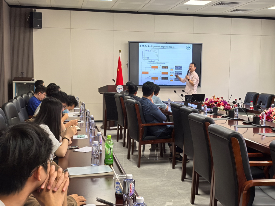 丁黎明老师带来了主题为《钙钛矿半导体研究进展和未来》的讲座。他首先从自身经历出发,以自己的学习研究经验提醒同学们要把握住研究的前沿,紧跟技术发展方向。“研究本身就像脚踩西瓜皮,但是在过程中抓住机会非常重要。”丁黎明老师的幽默话语迅速拉近了和现场老师和学生的距离。丁黎明老师为同学们展示了钙钛矿当前的研究主题和太阳电池,发光二极管,光探测器,场效应晶体管等应用场景。他表示,作为有机材料研究的学者,要多尝试多筛选。尤其是不同结构的特性,要敢于尝试,多做总结。最后,丁黎明老师和同学们强调,做研究也要学会多交朋友,课题研究一起做才更容易保持科研的热情。