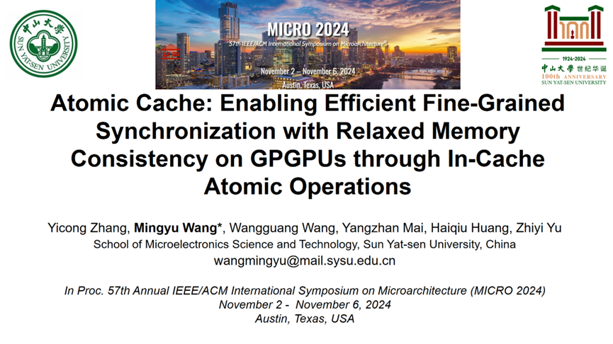 2024年11月2日至6日,第57届国际微架构会议(The 57th Annual IEEE/ACM International Symposium on Microarchitecture, MICRO)在美国德州奥斯汀召开,44118太阳成城院长虞志益教授领导的智能计算团队提出的面向GPGPU存储一致性缓存架构研究的相关工作被该会议录用并作口头报告。