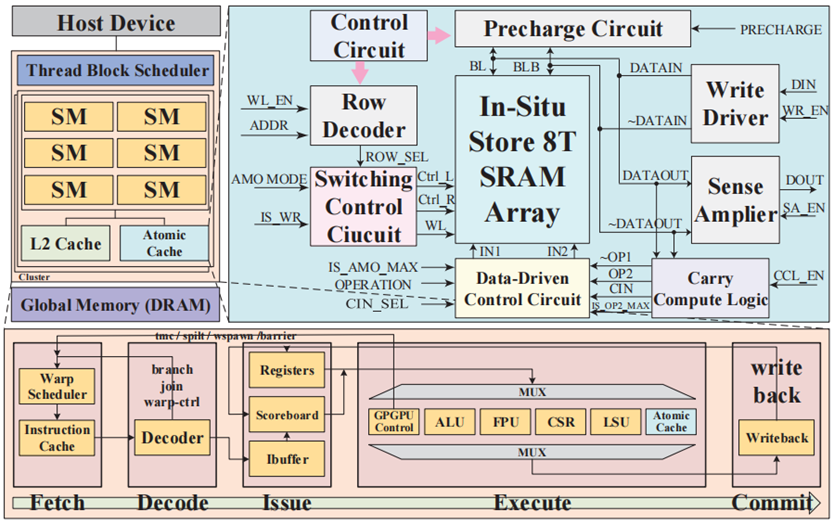 本论文主要针对GPGPU存储系统中的数据同步和原子操作效率等问题,提出了一种原子缓存(Atomic Cache),以促进GPGPU的内缓存计算硬件-软件协同设计。在软件层面,提出基于非排序交换的放松存储一致性模型,以减轻存内原子操作的执行,从而降低内存屏障的性能开销。在硬件层面,提出原位存储原子缓存电路,使得原子缓存能够高效地在缓存阵列内执行原子逻辑和算术操作。这些创新的优势体现在放宽对顺序一致性(SC)的严格要求可以避免内存屏障带来的性能损失,促进在原位存储SRAM阵列内高效执行原子性存内算术和逻辑计算可以缓解由原子操作序列化执行引起的冯·诺依曼瓶颈。实验评估结果表明,原子缓存在节省超过60%的内存访问能耗的同时,仅增加9.42%的芯片面积开销。此外,它不仅为基准GPGPU提供了平均2.59倍的加速比和1.48倍的IPC性能提升,还与采用本地原子缓冲区的最先进设计相比,实现了平均1.31倍的加速比和39.92%的IPC性能提升。