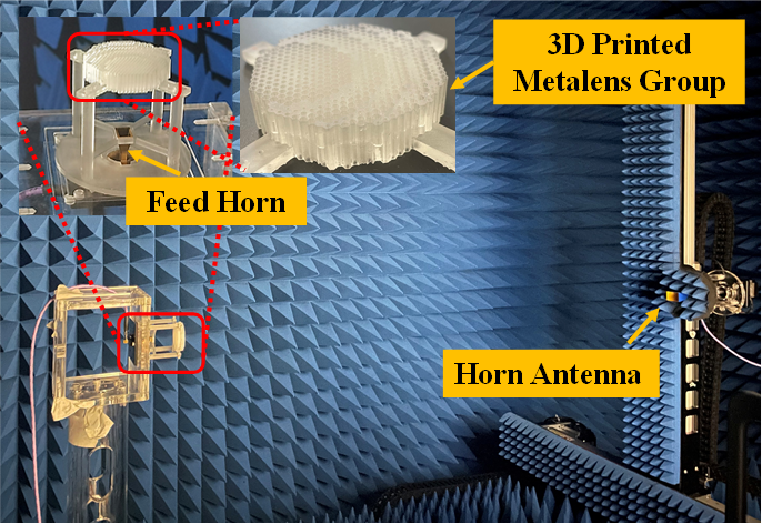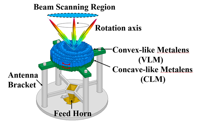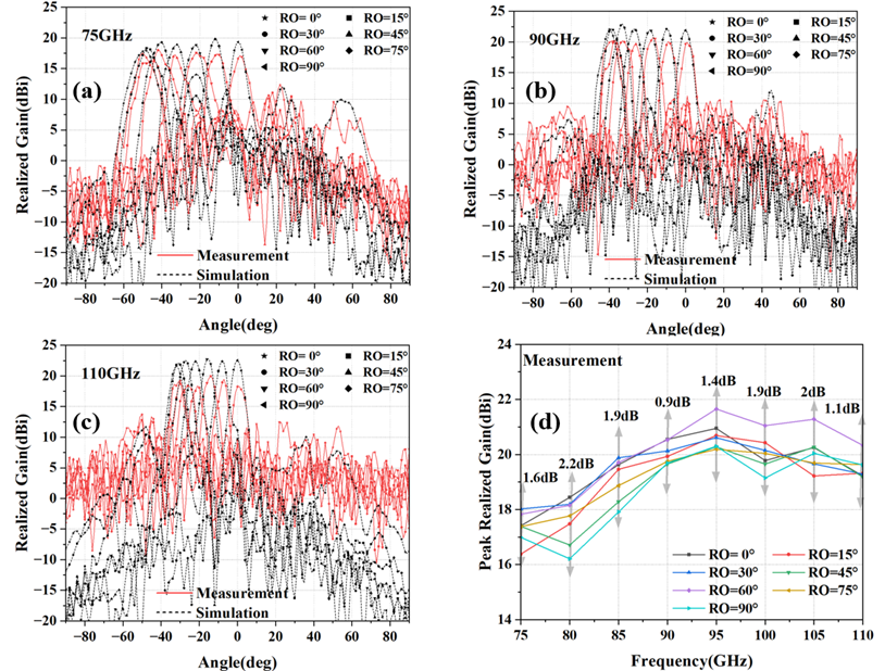 研究提出了一种带有空气孔的正六棱柱天线单元,通过合理设计每个单元中空气孔的形状和大小,精确设计介质的折射率分布,调控电磁波的相位、幅度等参数,实现对由馈源到阵面距离引起的相位差的补偿。通过3D打印技术,将天线支架、双层天线系统制造并测试。实测结果显示,在中心频率90GHz,天线最大增益为20.6dBi,扫描损耗为0.9dB,在W波段(75GHz-110Gz),主波束可以实现俯仰角±50°的扫描,扫描损耗均低于2.2dB,-3dB带宽超过33.5%。
