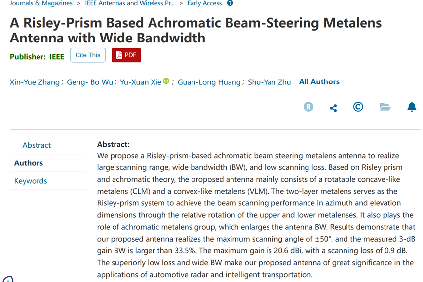 近日,我院20级本科生张馨月(第一作者)在SCI期刊《IEEE Antennas and Wireless Propagation Letters》(中科院二区)发表了题为“A Risley-Prism Based Achromatic Beam-Steering Metalens Antenna with Wide Bandwidth” 的研究成果,项目指导老师和论文通讯作者为朱述炎副教授。