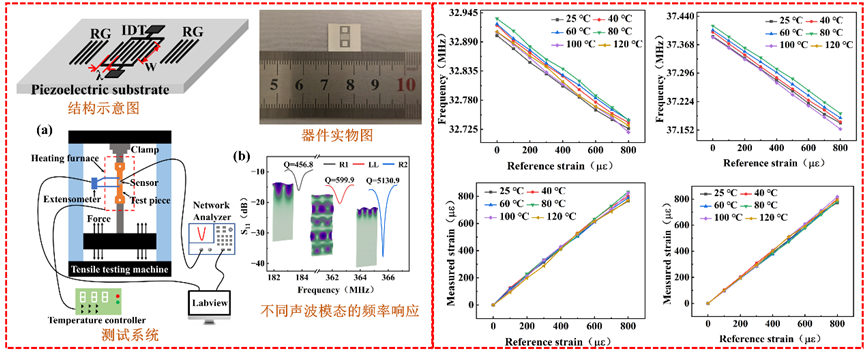 第一篇文章报道了一种基于128°Y切铌酸锂的表面声波(SAW)应变传感器,该传感器能够激发三种声波模态:一阶瑞利波(R1)、漏纵波(LL)和二阶瑞利波(R2)。我们分别对R1与LL、R1与R2进行拍频处理,实现了SAW应变传感器在25-120 ℃ 的温度范围内的片上自适应温度补偿。对于R1与R2拍频,在0-800 με的测试范围内,实测应变与参考应变之间的最大相对误差仅为5.8%,表明所开发的SAW应变传感器基本消除了温度对应变检测的影响。此外,所开发的SAW应变传感器的灵敏度为284.07 Hz/με,比文献中所报道的具有片上温度补偿能力的SAW应变传感器高出两个数量级。该研究不仅实现了SAW应变传感器的片上自适应温度补偿,还显著提高了其灵敏度,推动了SAW应变传感器在高温和密闭空间等恶劣环境中的应用。