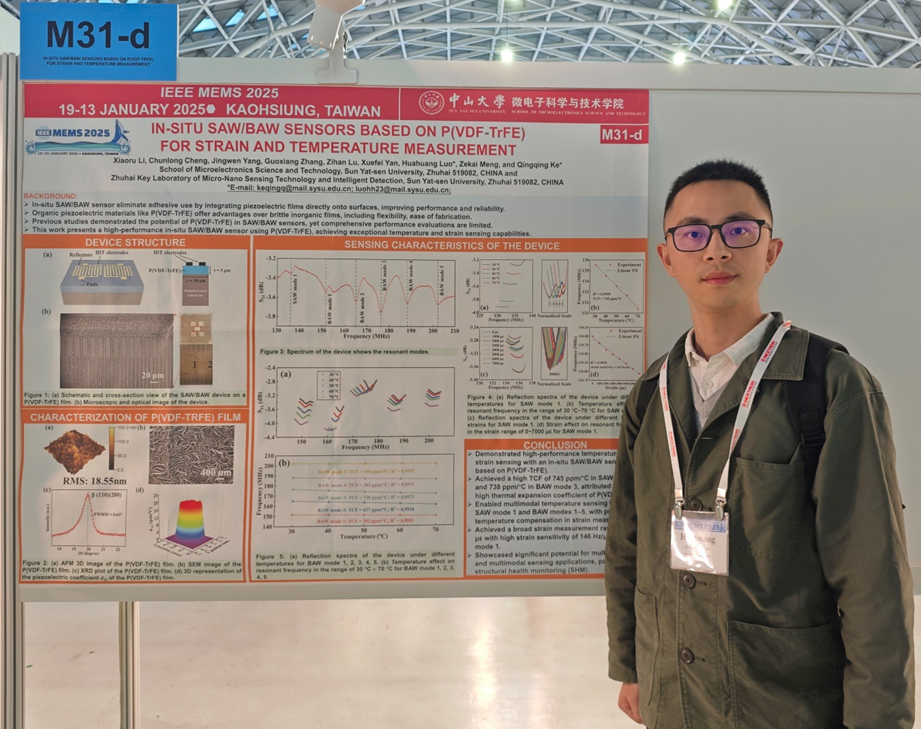 本届IEEE MEMS会议上,我院柯晴青教授研究团队发表的两篇成果题目分别为“Highly Sensitive Lithium Niobate-Based SAW Strain Sensor with On-chip Temperature Compensation”和“In-situ SAW/BAW Sensors based on P(VDF-TrFE) for Strain and Temperature Measurement”,是中山大学本届会议两篇入选的科研成果。我院柯晴青教授与罗华煌助理教授为通讯作者,博士研究生程春龙、李笑儒分别为两篇论文的第一作者。罗华煌助理教授作为研究团队代表,赴高雄参加本届IEEE MEMS会议。
