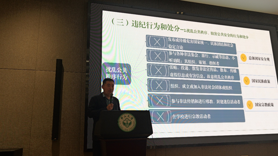 会议伊始,王昕副书记向同学们解读了《中山大学学生处分管理规定》并强调学生纪律教育。他从纪律处分和党纪处分两个角度向同学们介绍了相关的处分管理规定,并详细阐述了违纪行为的类别及其对应后果,提醒大家要时刻遵守校规校纪,维护良好的学风校风。他还结合实际案例,分析了纪律处分对学生未来发展的影响,强调同学们要严于律己,确保校园和谐稳定。