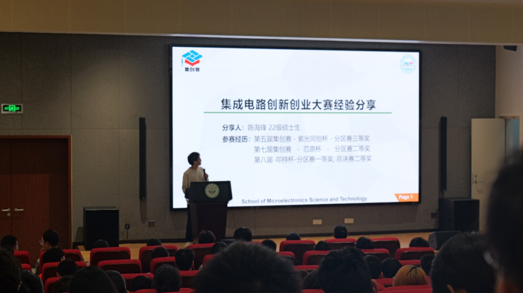 彭云根老师最后向同学们进行了赛事宣讲。在宣讲会上,彭云根老师详细介绍了微电子学科竞赛的规则、流程、评价标准、报销流程和奖励制度。会议还特别邀请了参加过五届集创赛并取得优异成绩的22级研究生陈海锋同学,他详细分享了参赛的前期准备,包括选题的精准定位和高效组队的策略,以及参赛流程中的关键环节和注意事项,为在座同学提供了宝贵的实战经验。