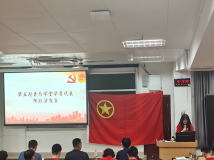 阳欣洁同学作为第五期青马学堂优秀学员代表,分享了学习感悟。她回顾了在学堂中的思想蜕变与实践收获:通过党史学习坚定了理想信念,在参观革命烈士陵园时深受先烈精神感召;在中华白海豚科普馆认识到生态保护的重要性。她特别提到老一辈科学家的事迹激励自己立志科技报国,并强调新时代青年要践行马克思主义精神,将理论学习转化为实际行动。最后,她号召同学们勇担使命,在持续探索中成长,为民族复兴贡献青春力量。