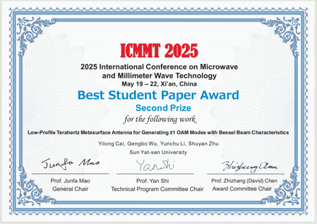5月19日至22日,由中国电子学会主办,中国电子学会微波分会和西安电子科技大学联合承办的2025年中国微波周在中国西安曲江国际会议中心顺利举行。我院硕士生蔡颐龙,以出色的表现获得2025年度国际微波毫米波技术会议(IEEE ICMMT 2025)最佳学生论文奖(二等奖)。该论文指导老师为我院朱述炎副教授。
