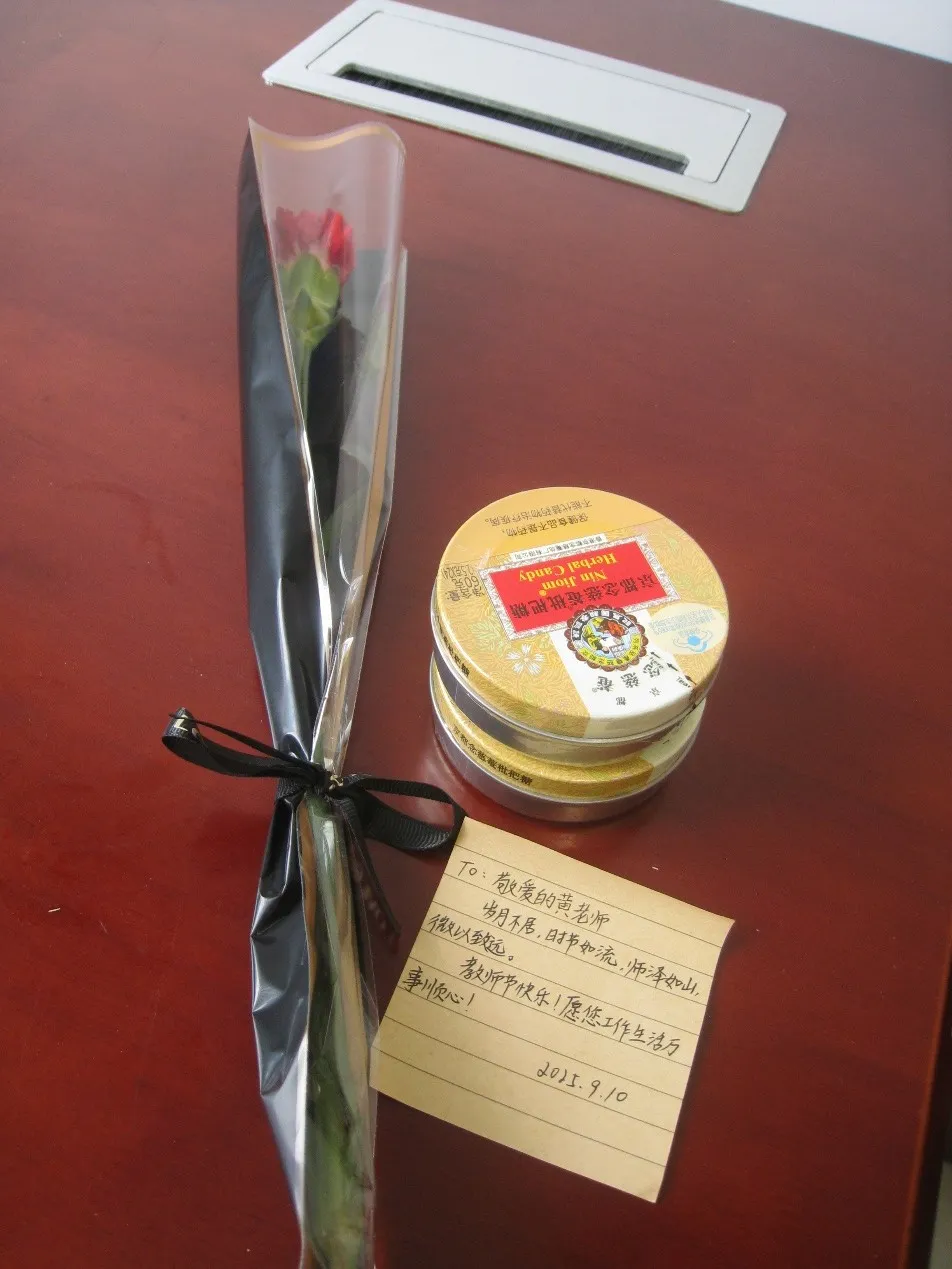 当天,由同学们将这份心意亲手送到老师们的手中。正在课堂授课的老师们在讲台上收到了鲜花与润喉糖,课堂氛围因此更加温馨而动人;未在课堂的老师们,则由同学们专程送至办公室,传递一份真挚而细致的关怀。
