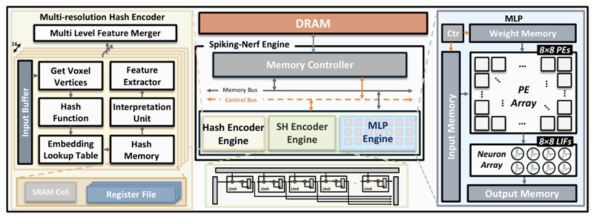 2)硬件架构层面:设计并实现了一款专用的Spiking-NeRF加速器。该架构集成了脉冲跳过机制,能够动态绕过无效的哈希条目,减少了32.46%的冗余内存访问。同时,针对不同分辨率层级的哈希结构,团队协同优化了片上存储方案,利用访问局部性进一步提升了数据吞吐率。