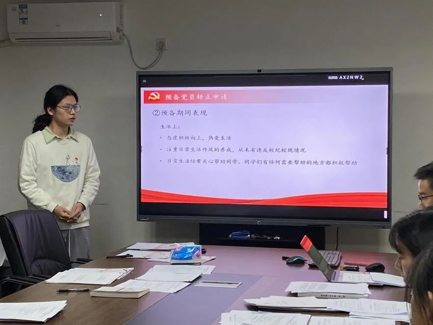 首先是召开支部党员大会接收发展对象。按照会议流程,先由蒋斯汗等9名发展对象逐个进行自我汇报,大家纷纷结合自身经历讲述了自己的入党动机以及对党的深刻认识,并认真反思自身在生活学习中的优缺点,表达了坚定的入党信念。