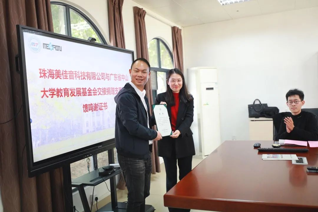 仪式伊始,在现场嘉宾和师生代表的见证下,珠海美佳音科技有限公司与广东省中山大学教育发展基金会进行了捐赠交接仪式,并向企业授予了捐赠鸣谢证书。