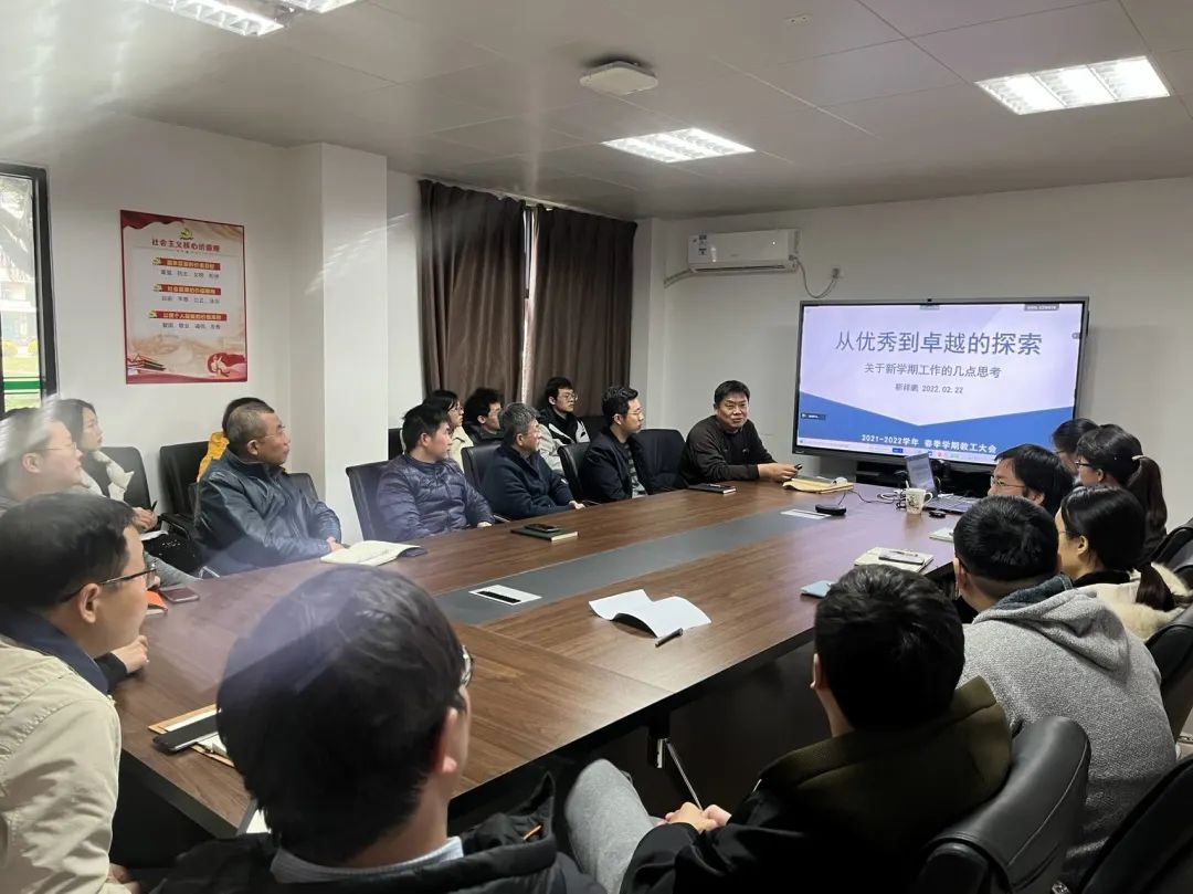 会议进行至学院领导做新学期工作布置,虞志益副院长从人才引进、培育,学生培养,学科及平台建设与科研四部分向大家简述了学院新学期工作布置。他重点强调今年人才新增目标,鼓励老师们积极申办学术会议,加强科研交流,可以和企业联合培养人才,积极宣传学院人才招聘政策;此外,也要高质量完成教书育人的核心教学工作,课程思政积极落实,注重课程体系打造,建立产教融合基地,建立联合培养及实习机制;学生工作也是新学期工作的重点,转专业学生课程认定,硕士研究生面试等需要所有老师共同努力推进。随后,虞志益副院长提到应尽快启动2022年年度设备采购任务配合学院楼装修及搬迁进度,全面提升本年度科研工作水平,他向大家简要公布了年度经费支持,鼓励老师们写专著,产生学院的标志性成果,同时也建议学院增加更多科研成果的宣传,推动专业微电的建设。
