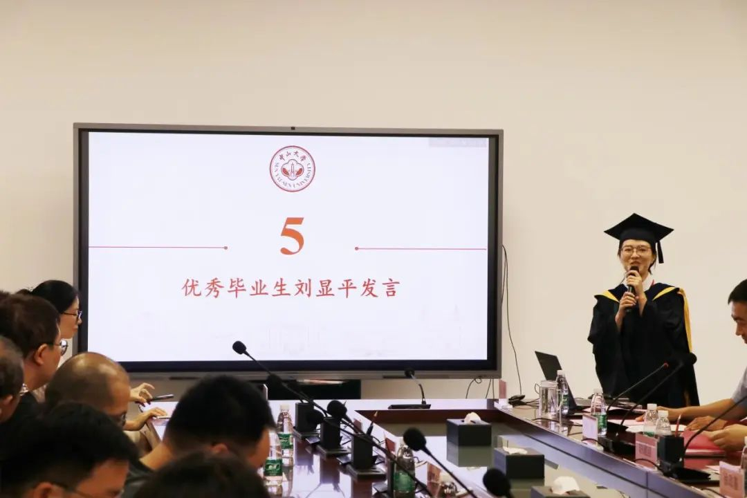 随后,优秀毕业生刘显平发言。她提到自己所享受到的宝贵的教育资源离不开身边人的辛苦付出,谨代表全体同学向学院的领导、老师表示真挚的感谢。她也感激父母、朋友和同学的支持与帮助,感激自己一直坚持向上、不懈怠不放弃。最后她表示,人生旅途上鲜花与荆棘同在,需坚持脚踏实地、尽力而为,祝福同学们毕业快乐。