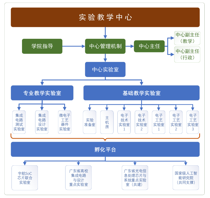 中心设有集成电路设计与测试实验室、微电子工艺器件实验室、电子技术公共实验平台等共计10个实验室,仪器设备总值约5280万元,面积约2000平方米。中心主要负责承担学院实验教学和面向全校承担电子信息类公共课程的实验教学任务,同时,中心积极组织实践实训、学院“创芯”大赛、大学生创新创业训练计划项目等第二课堂活动,为学生参加省部级、国家级赛事提供软硬件平台。2024年12月,中心获批广东省本科实验教学示范中心项目立项。
